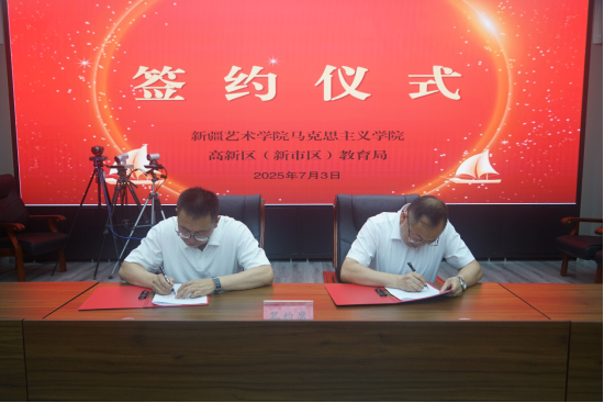 随后,在与会人员的共同见证下,新疆艺术学院马克思主义学院与高新区(新市区)教育局正式签订合作框架协议。协议明确,双方将围绕四大方向开展合作:一是共建思政课师资研修基地,由高校专家团队定期为中小学思政教师开展专题培训、教学研讨,提升一线教师理论素养与教学能力;二是共研思政课程体系,针对小学、初中、高中不同学段学生认知特点,联合开发衔接有序、各有侧重的课程内容与教学资源;三是共推实践教学融合,依托高校红色教育资源与地方中小学实践基地,打造 “理论 + 实践” 的沉浸式思政课堂;四是共享教研成果,建立常态化交流机制,通过联合申报课题、发表研究论文等方式,推动思政教育理论与实践创新。