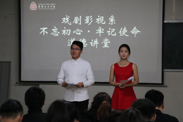 为全面学习宣传贯彻党的十九大精神,使当代大学生树立正确的价值观,新疆艺术学院戏剧影视系2017级播音、戏文、舞美班于2017年12月19日在613教室举办了主题为“不忘初心·牢记使命”的道德讲堂活动,戏剧系2017级全体班主任、专业老师和学生代表参加了此次活动.