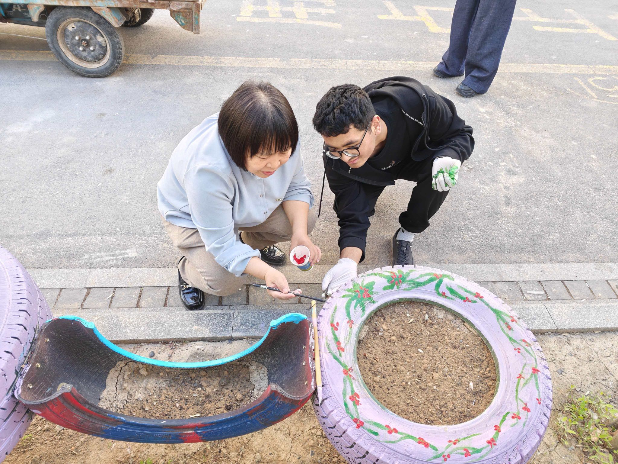 彩绘后的轮胎被布置为花坛围栏、休闲座椅和儿童游乐设施点缀,既美化了人居环境,又传递了文明理念。活动现场,不少居民驻足观看,有的主动加入创作队伍,与大学生一起调色、勾线、填色,在欢声笑语中拉近了高校与社区的距离。